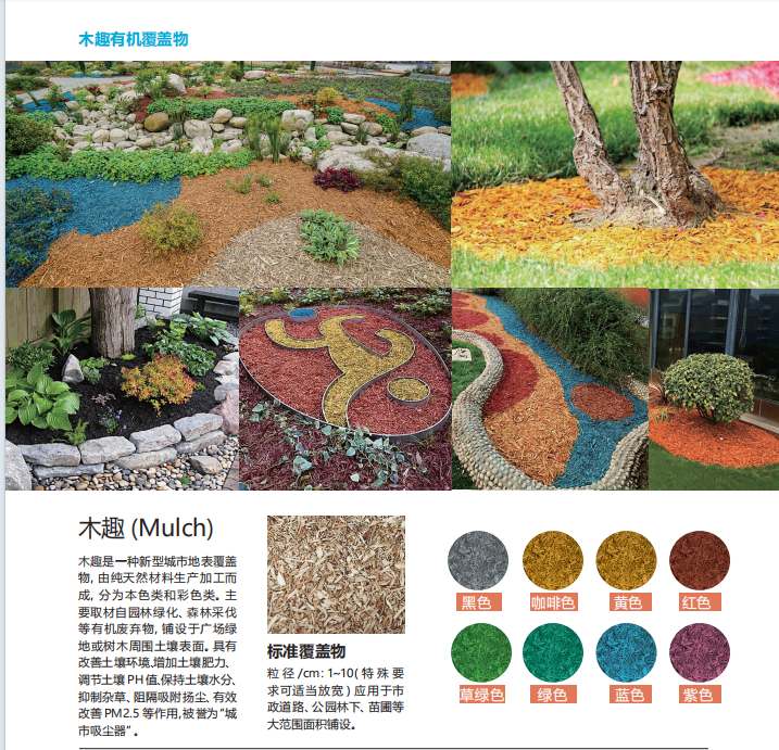 有機覆蓋物:是利用各種有機生物體材料,通過各種生產工藝,加工處理后鋪設于園藝植物或樹木周圍的土壤表面,起保持土壤水 分、吸附揚塵、調節土壤溫度、增加土壤肥力、抑制雜草、促進植栽生長、減少土壤侵蝕和緊實度以及裝飾美觀等等作用。(如下圖)